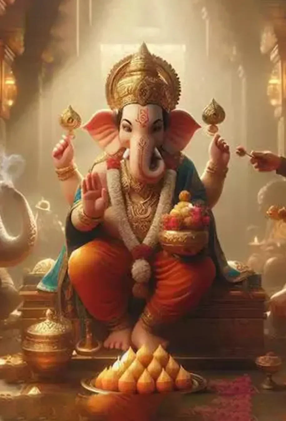 It is said that once the Devas offered a divine sweet called Modak to Lord Ganesh. Delighted by its taste, he declared it his favorite, calling it the symbol of wisdom, bliss, and inner joy. The round shape of the modak also represents completeness and spiritual knowledge hidden within.